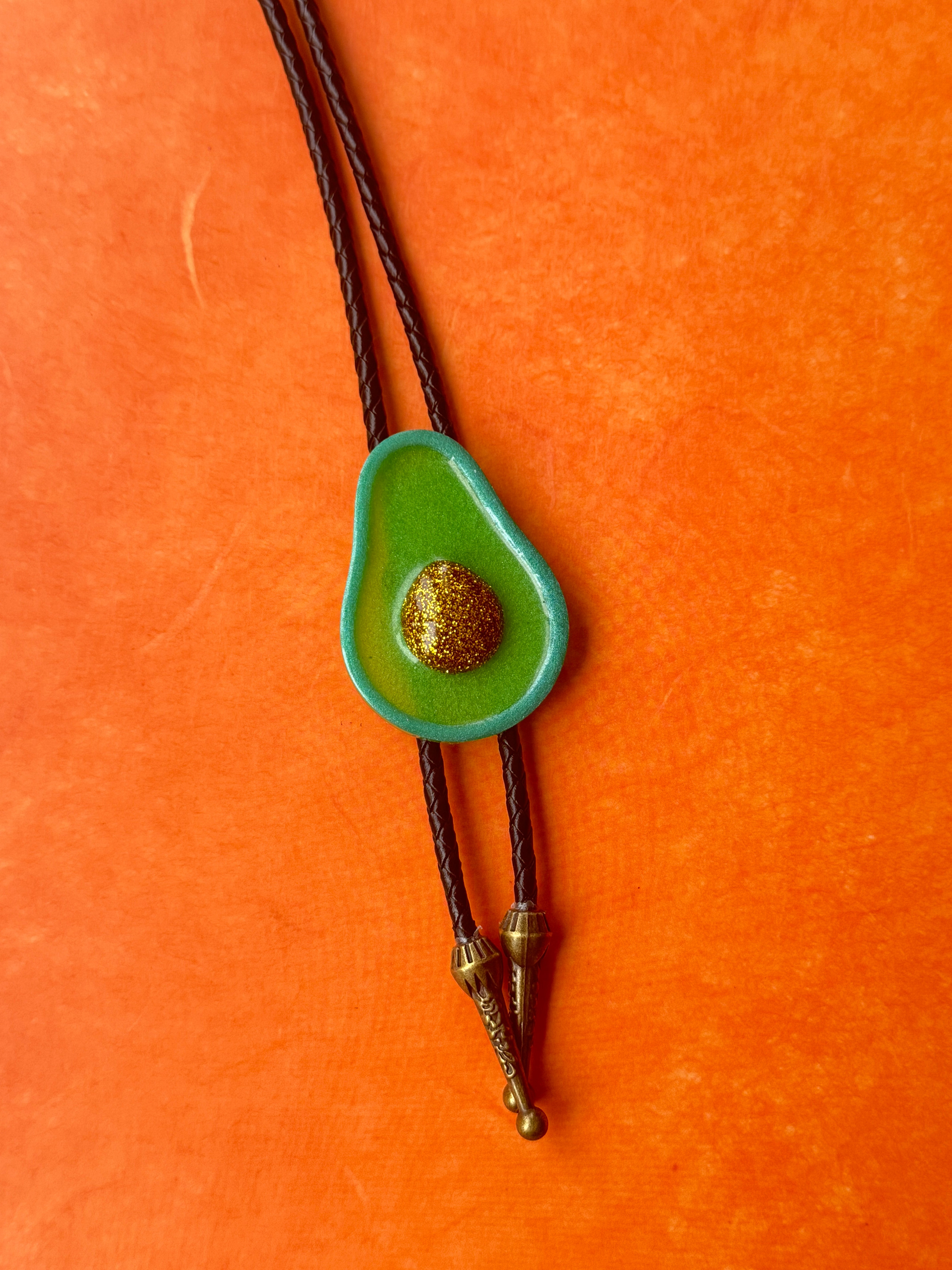 Add some fun to your style with the Avocado Bolo Tie! This unique accessory features a handmade avocado on a leather braided cord, perfect for adding a playful touch to any outfit. Get ready to guac and roll with this one-of-a-kind bolo tie!