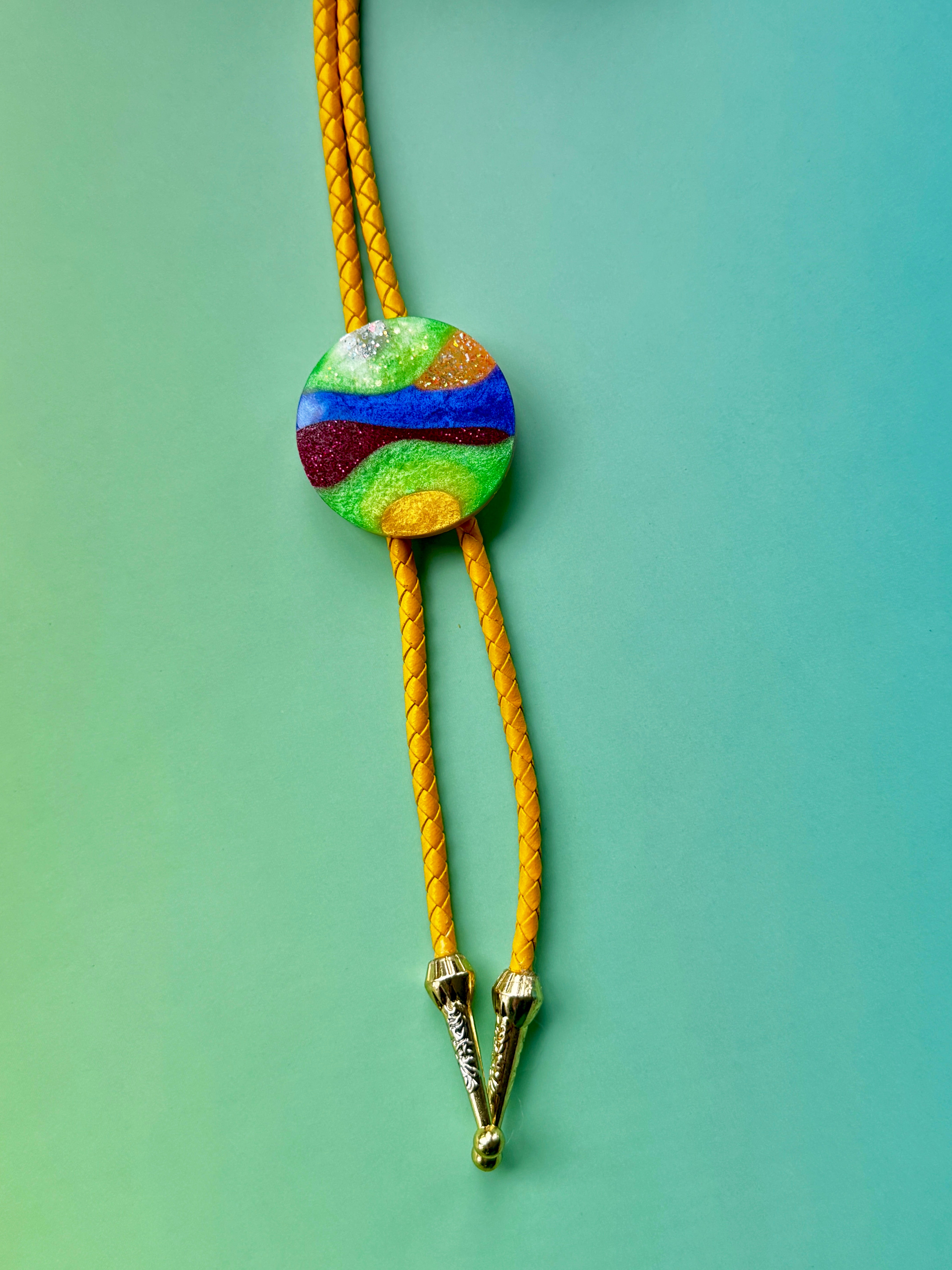 Dress up your look with the Mix Masta Bolo Tie! This playful and quirky bolo tie features a fun mix of colours and genuine braided leather for a unique look. No more boring outfits - add some character with the Mix Masta Bolo Tie! Yeehaw!