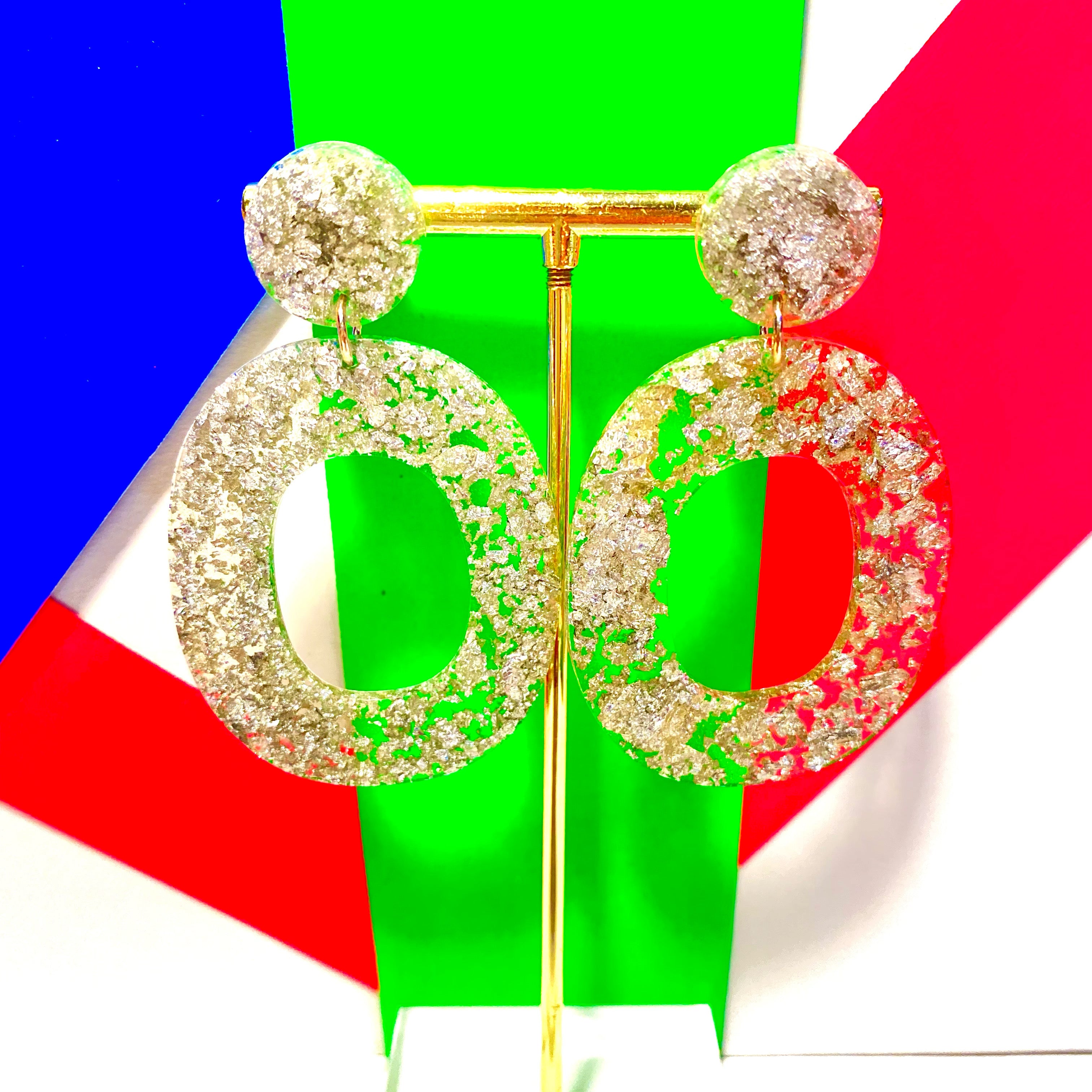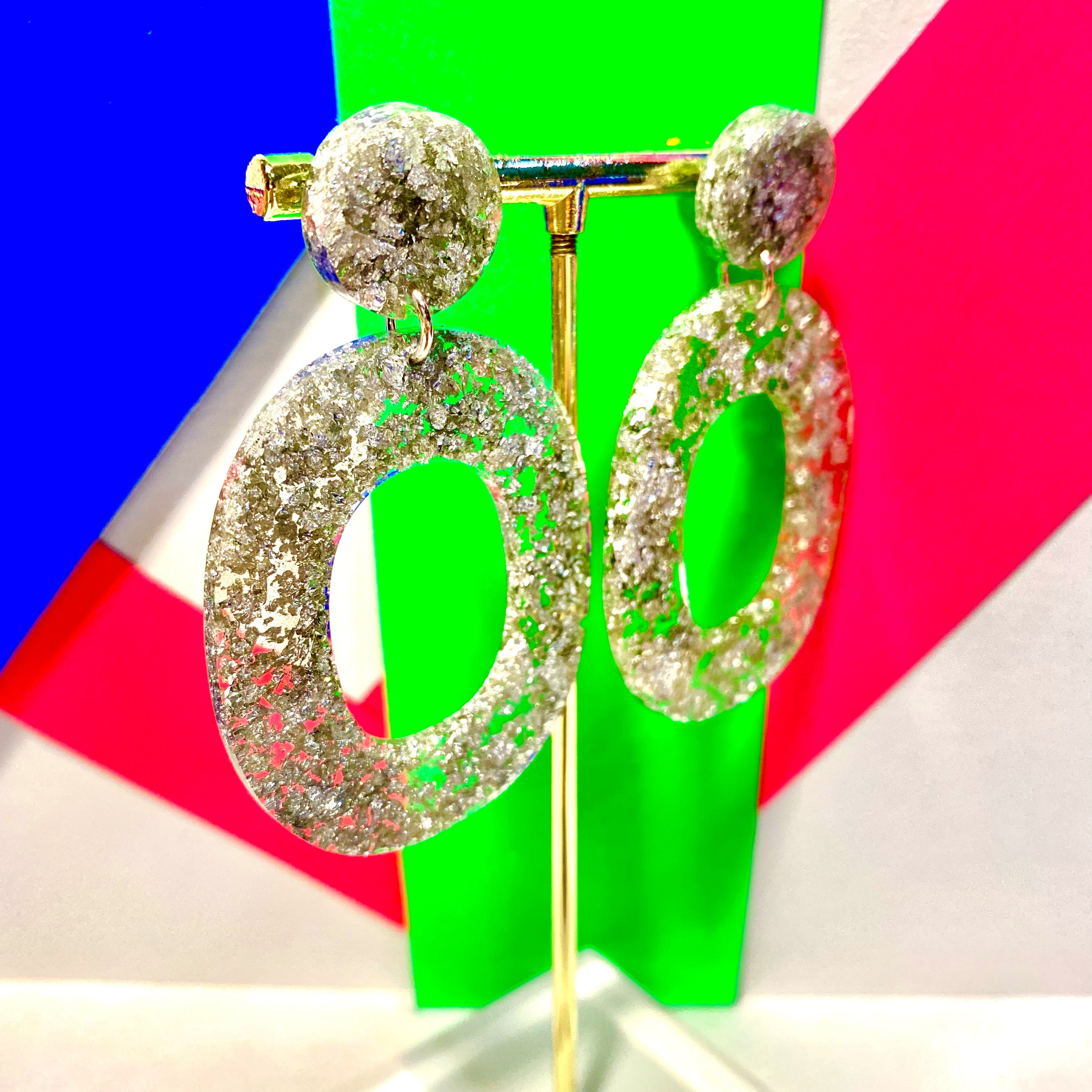 Designed using crushed silver leaf mixed in with resin. Hypoallergenic stud backs for those with sensi ears.