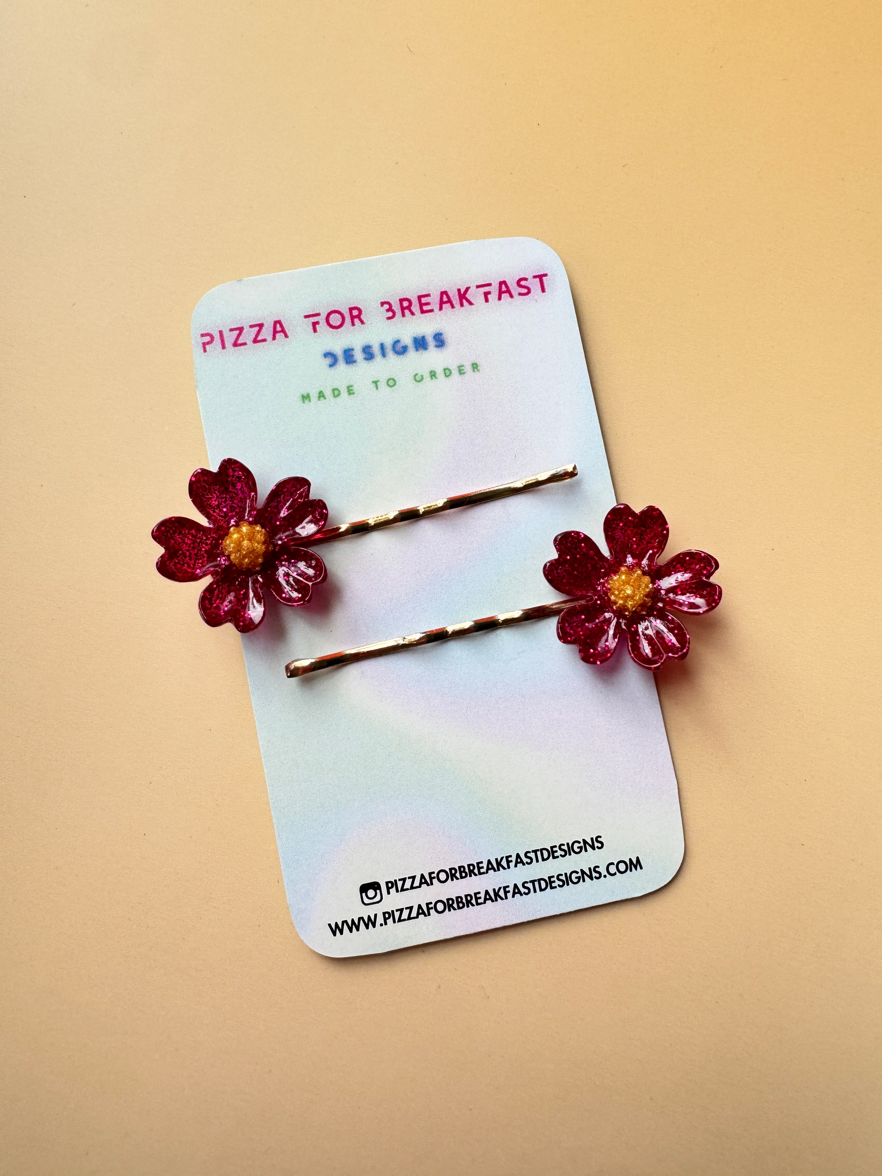 Hold your hair in style with these charming Blossom Bobby Pins! Featuring delicate flower accents paired with shimmering pink glitter and gold details. Whether you're getting ready for a special occasion or just want to brighten your day, these pretty pins make hair care feel like a celebration!