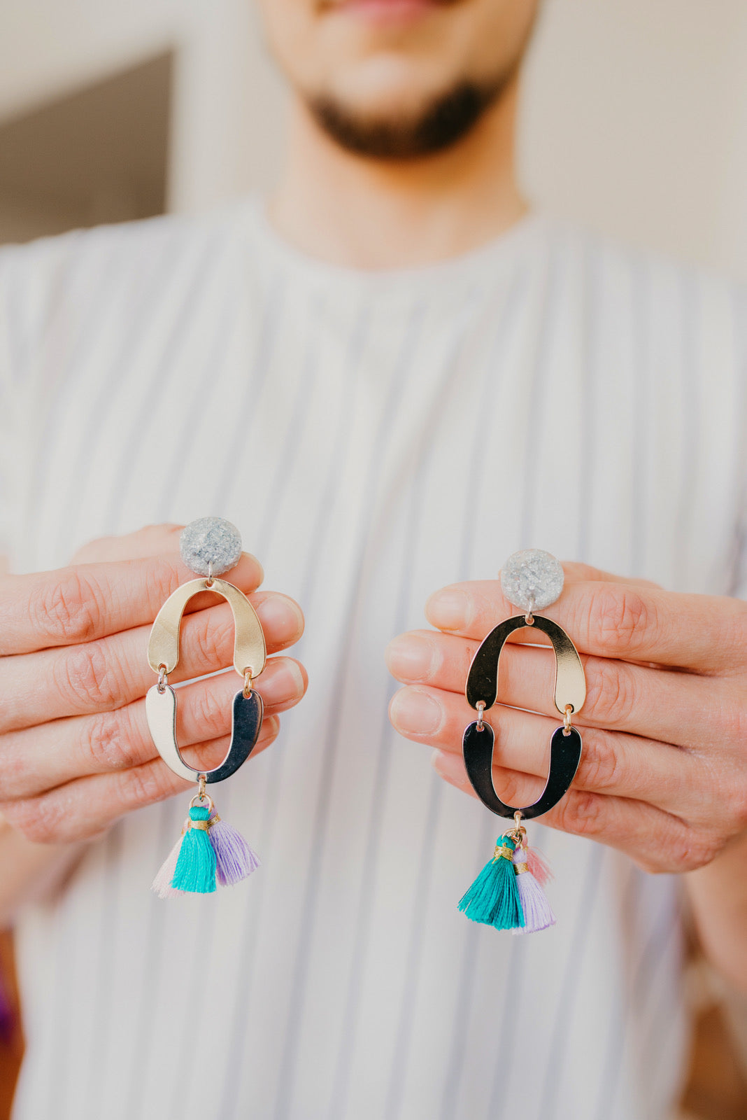 Made with one rose gold and one silver plated piece, three spring flavoured tassels and a delicate silver leaf resin topper to finish it off. Earring pins are made with hypoallergenic alloy metal for those with sensitive ears.