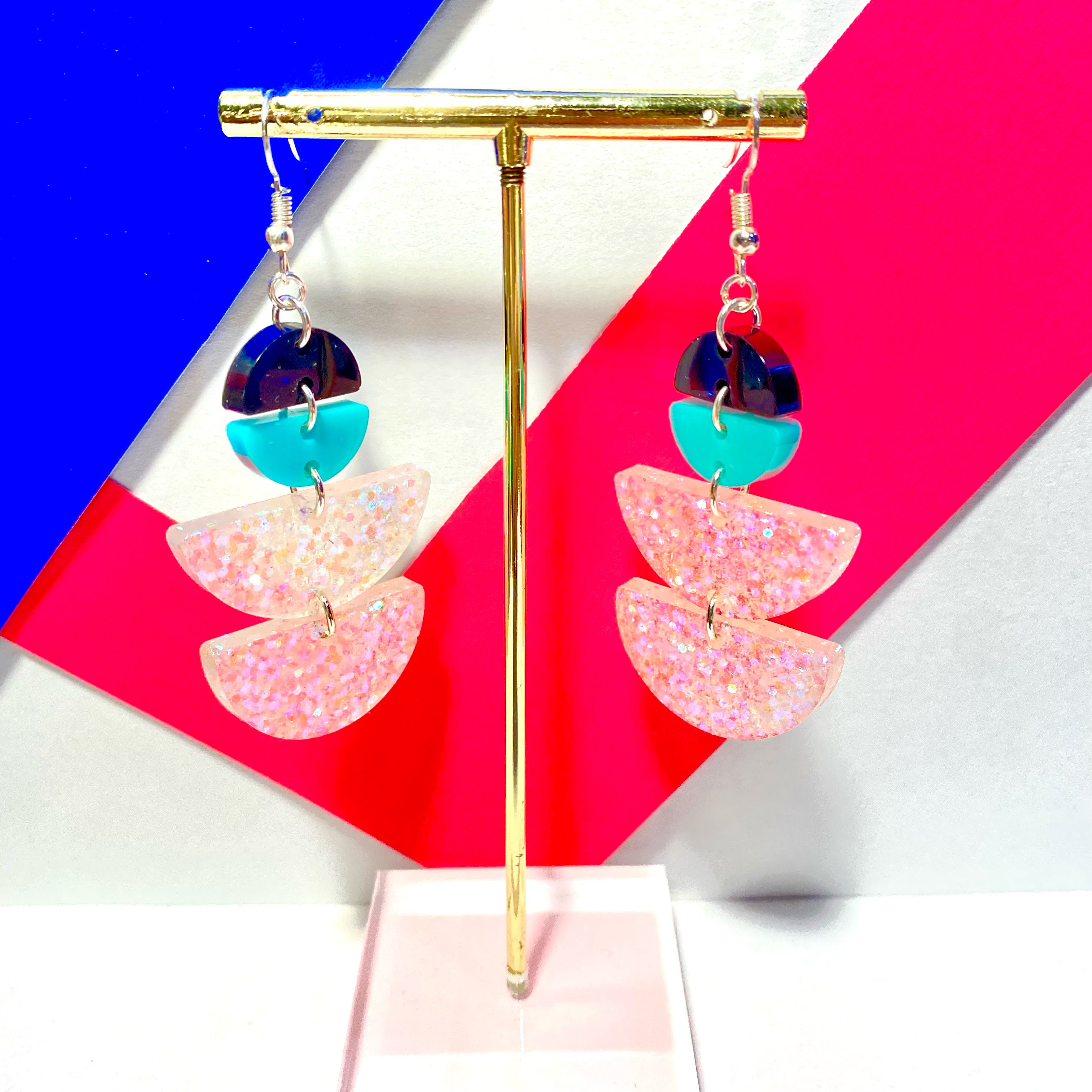 This snazzy pair of dangles is a geometric lover's dream. Made with several half circles to create the full design, these earrings are ready to snazz up any outfit.